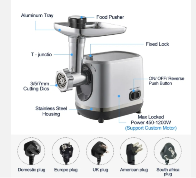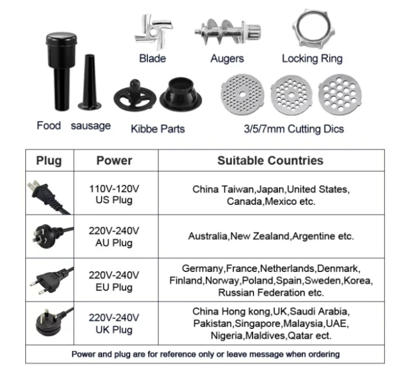 Nennspannung | Wechselstrom 220–240 V oder 110–120 V | Hauptfunktion des Fleischwolfs | Mit Lebensmittelaufbewahrungsschieber, Kubbe und Wurstaufsatz |