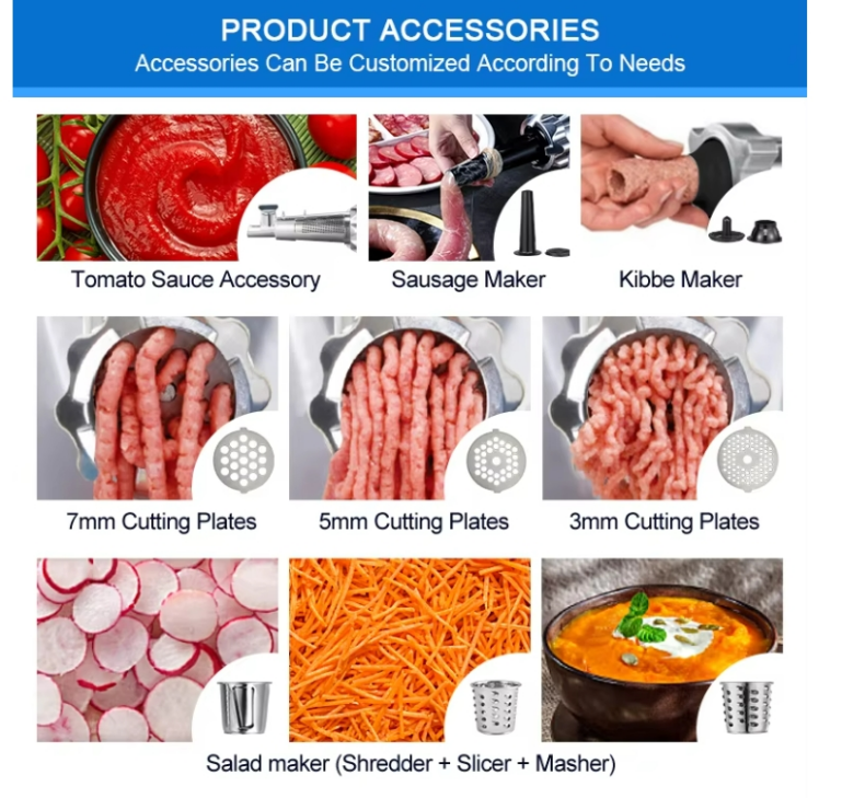 Der Fleischwolf kann nicht nur zum Zerkleinern von Fleisch, sondern auch zum Zubereiten von Füllungen, zum Rühren von Teig, zum Zubereiten von Eiermischungen usw. verwendet werden. Er ist vielseitig einsetzbar und verbessert die Effizienz der Küche.